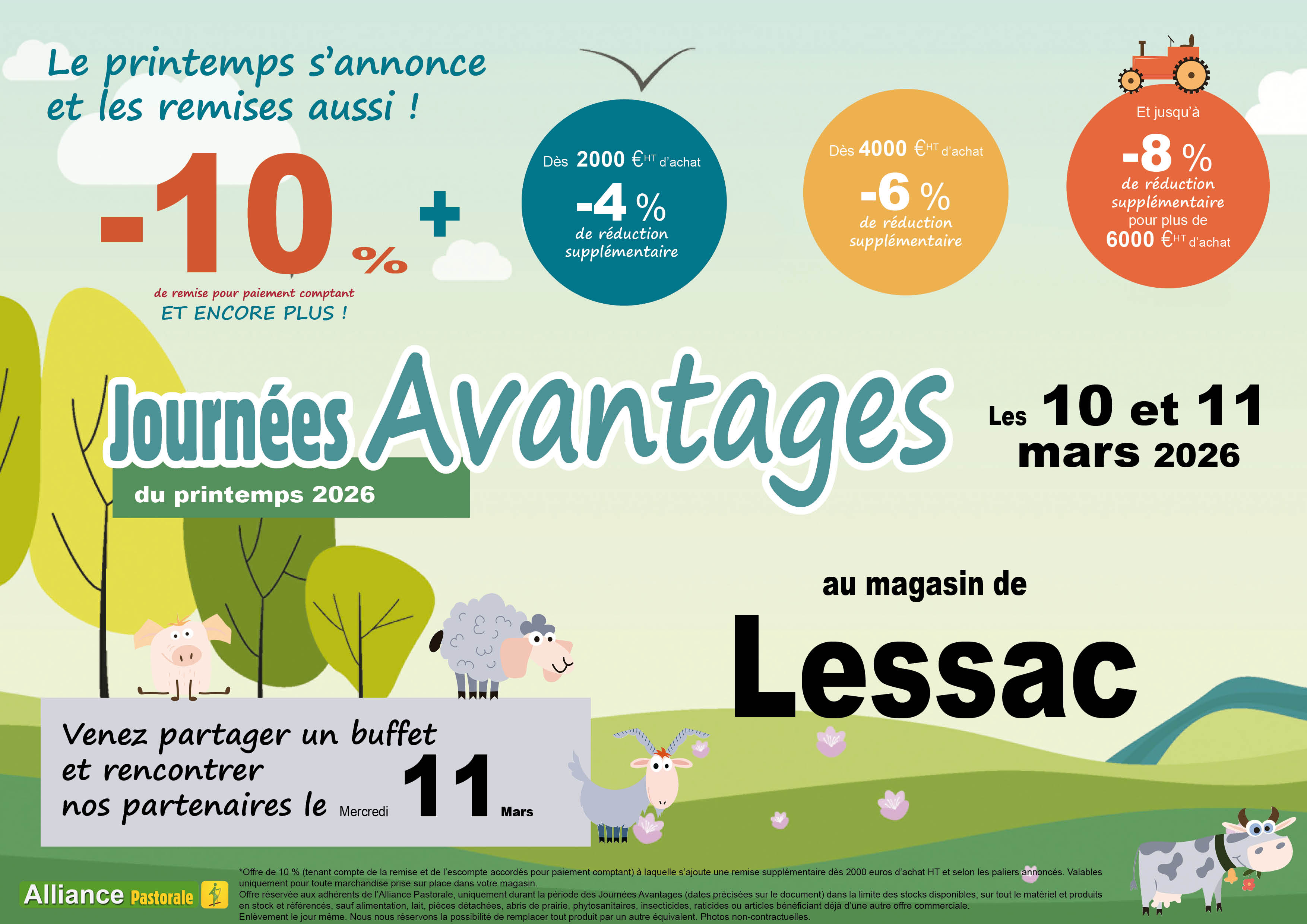 Le magasin Alliance de Lessac en Charente est en Journées Avantages les 10 et 11 mars. Venez profiter des remises exceptionnelles sur de nombreuses gammes....