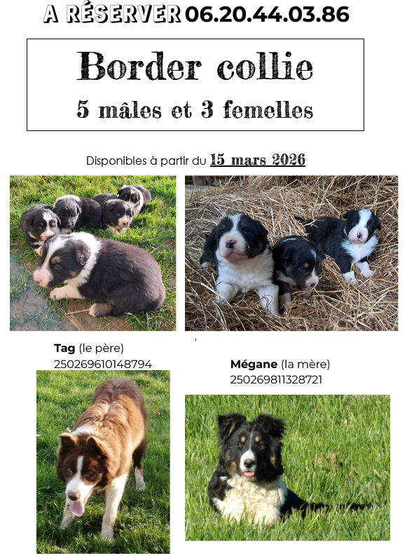 5 mâles et 3 femelles tricolores, issus de parents travaillant sur bovins, ovins.
