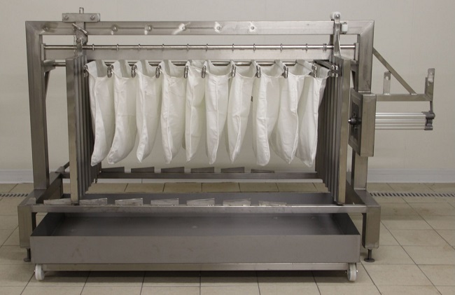 Contrairement aux fromages lactiques traditionnels qui sont moulés, puis égouttés dans des moules, les caillés pré-égouttés sont directement déversés puis égouttés dans des sacs en toile. En petites quantités, les sacs sont pendus, ou déposés dans des bacs. Lorsque le volume devient conséquent, le filtre presse permet de presser plusieurs sacs de façon mécanique et maitrisée.