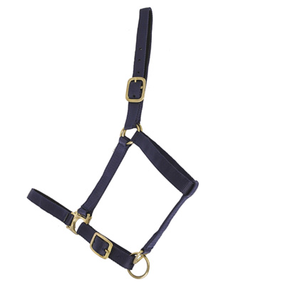 Nylon triple épaisseur avec muserolle et têtières réglables doublées croûte de cuir de buffle noir. Bouclerie métal jaune. Taille: Double poney (cob): noir, rouge, bleu marine et bleu truquoise. (Vendu sans la longe)