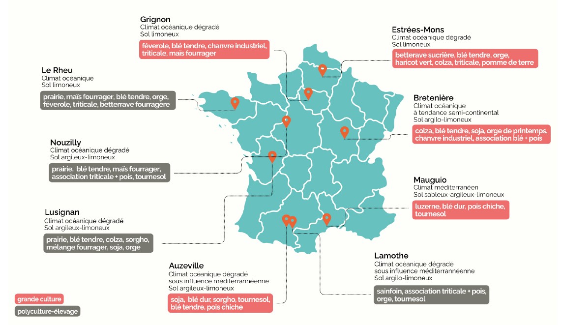 Rés0pest, mis en place en 2012 dans le cadre d’un appel à projets Ecophyto Dephy Expe, s’est appuyé sur 9 systèmes de culture originaux sans utilisation de pesticides, mais avec un recours possible au travail du sol et aux engrais de synthèse. Ceux-ci ont été imaginés lors d’ateliers de co-conception associant des conseillers agricoles, des agriculteurs et des scientifiques, sur 9 sites localisés dans l’Hexagone et couvrant une large gamme de conditions pédoclimatiques et de contextes socio-économiques (5 systèmes de grande culture et 4 systèmes en polyculture-élevage incluant des prairies temporaires), au sein du réseau d’unités expérimentales d’INRAE, des laboratoires à ciel ouvert gérés par des ingénieurs et techniciens de l’institut.