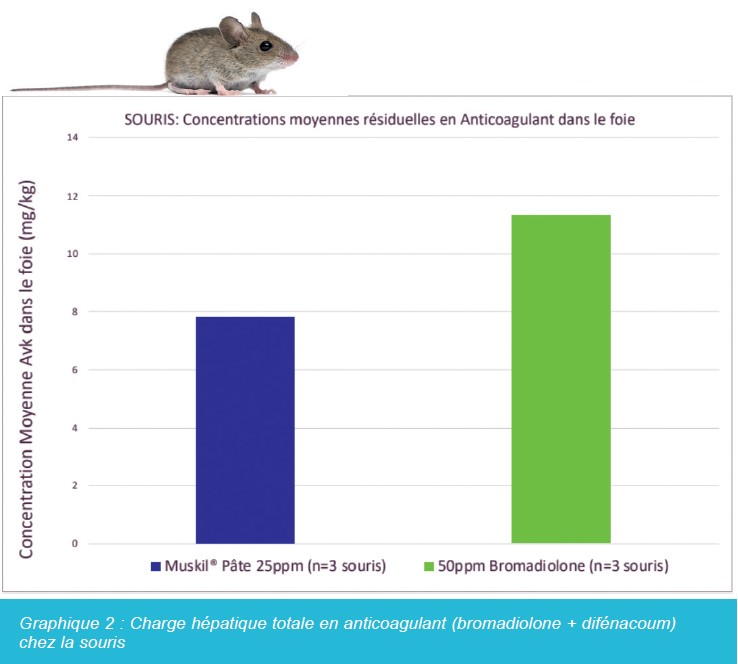 Chez le rat comme chez la souris, la charge totale en anticoagulant diminue avec Muskil vis-à-vis de la charge observée avec un appât contenant 50ppm de bromadiolone (Graphique 1 et Graphique 2).