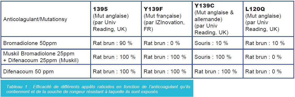 Ces différents travaux montrent que la bromadiolone, le difénacoum et les 2 en mélange ne parviennent pas à contrôler des rats portant la mutation L120Q, très connue pour provoquer une très forte résistance sur le terrain (Tableau 1). Toutes les formulations fonctionnent bien sur les rats porteurs de la mutation Y139S. Il est intéressant de montrer que la formulation Muskil est efficace sur les souches de rats Y139F (surtout développées en France) et sur les souris Y139C alors qu’une formulation unique de bromadiolone n’est pas efficace. Le mélange présente ici un réel intérêt et c’est la première fois que ces observations sont réalisées avec le produit Muskil.