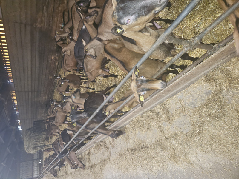 Chèvres début de lactation, 10 boucs issus d'IA de 1 an et 47 chevrettes en gestation.